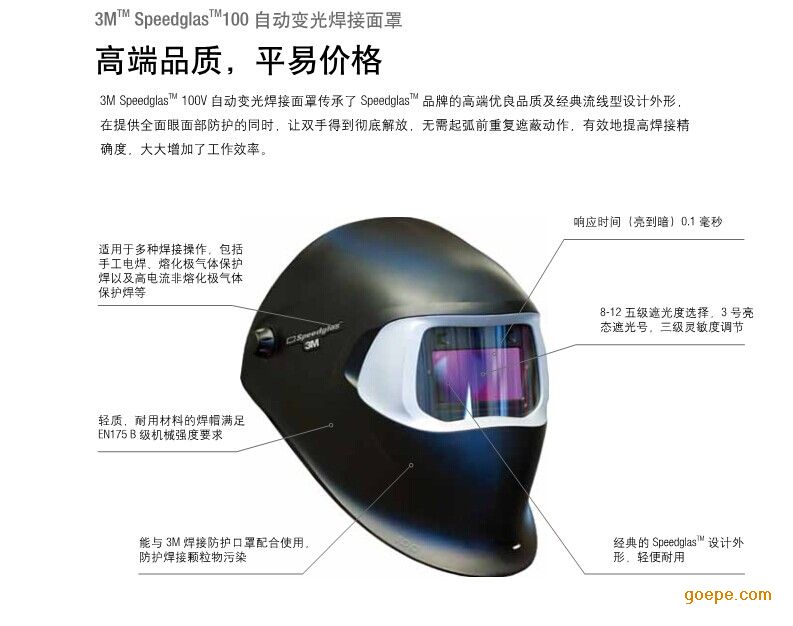 3M SpeedgasTM 100V自动变光焊接面罩传承了SpeedglasTM品牌的高端优良品质及经典流线型设计外形,在提供全面眼面部防护的同时,让双手得到彻底解放。无需起弧前重复遮蔽动作,有效地提高焊接精确度,大大增加了工作效率。